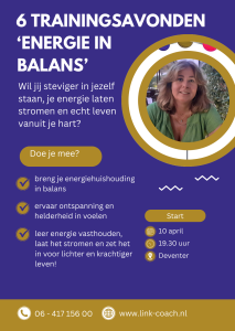 - 6 Trainingsavonden ‘Energie in balans’In deze 6 avonden (19.30 – 22.00 uur) ontdek je hoe je je energiehuishouding in balans brengt, meer ontspanning ervaart en helderheid krijgt in je voelen en denken. Je leert hoe je energie kunt vasthouden, laten stromen en inzetten voor een lichter en krachtiger leven. En… Read more: 6 Trainingsavonden ‘Energie in balans’